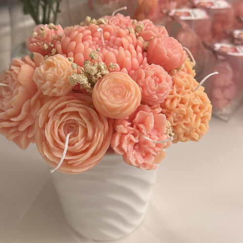 Bring elegance and warmth into your space with this handmade flower bouquet candle arrangement.